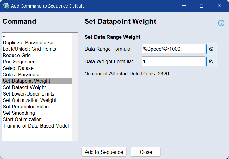 Use the Set Dataset Weight command to assign weights to individual training datasets or all datasets involved in the optimization. This determines how strongly each dataset influences the optimization result.