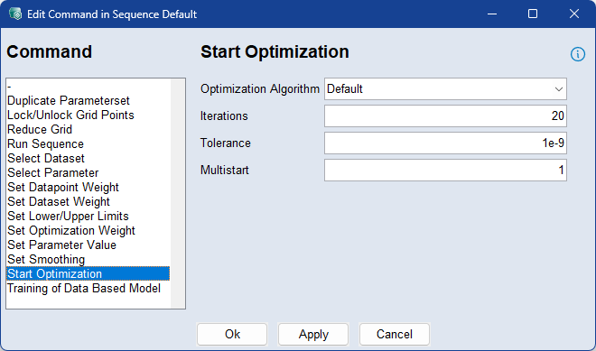 To apply the start optimization command, select the algorithm, enter the maximum number of iterations, the stopping tolerance, and the number of optimization runs (Multistart). These fields correspond to the Optimization Options in the Optimize step and control how thoroughly and precisely the optimizer searches for a solution.