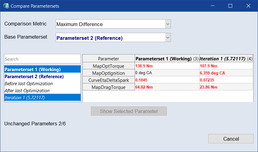 Compare selected Parametersets: Opens the