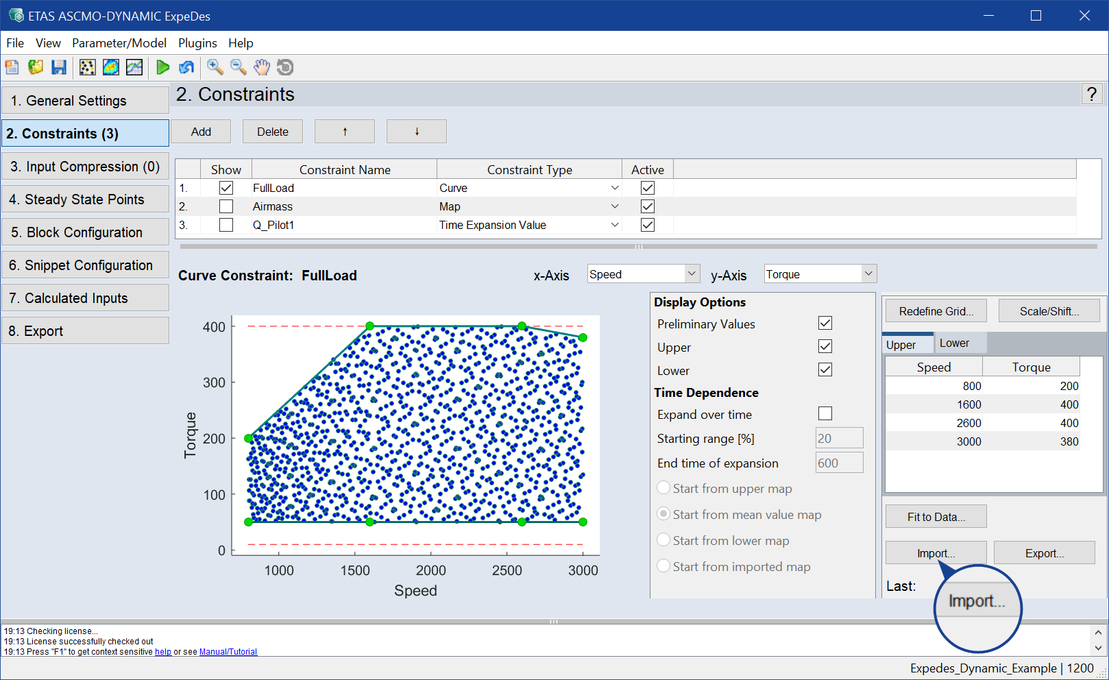 Click Import at the bottom right (see region E in ASCMO-DYNAMIC ExpeDes Step 2: Constraints (Type Curve)).
