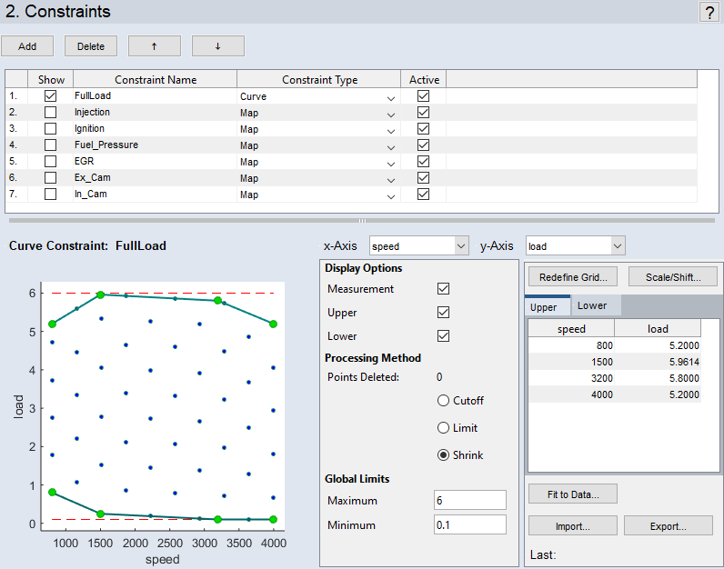 This step deals with constraints of the measurement range of a variable as a function of other variables. For example, it may be desirable to avoid high loads in case of high rotational speeds.
