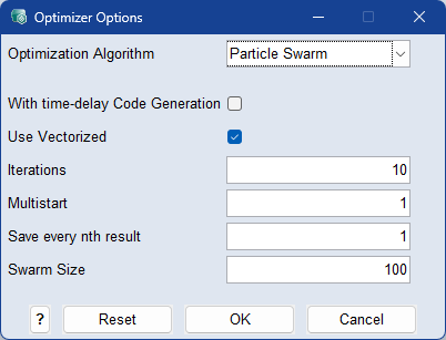 The number of candidate solutions available during the optimization process. Enlarging the swarm size leads to longer optimization duration and increased memory usage, but may lead to better solutions. Typical values range from 50 to 200.