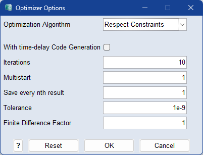 If the output of a model does not change by such a small value, the optimizer stops at the first iteration. In this case, the Finite Difference Factor must be increased. Typical values are 10, 100, 1000, 10,000,...