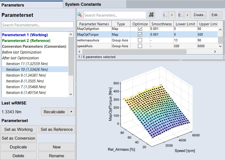 ASCMO-MOCAでは、複数のパラメータセットを管理して使用することができます。1組のパラメータセットは必ずワーキングパラメータセットとリファレンスパラメータセットとして定義されます。最適化ステップにおいてはワーキングパラメータセットに対して最適化が行われます。
