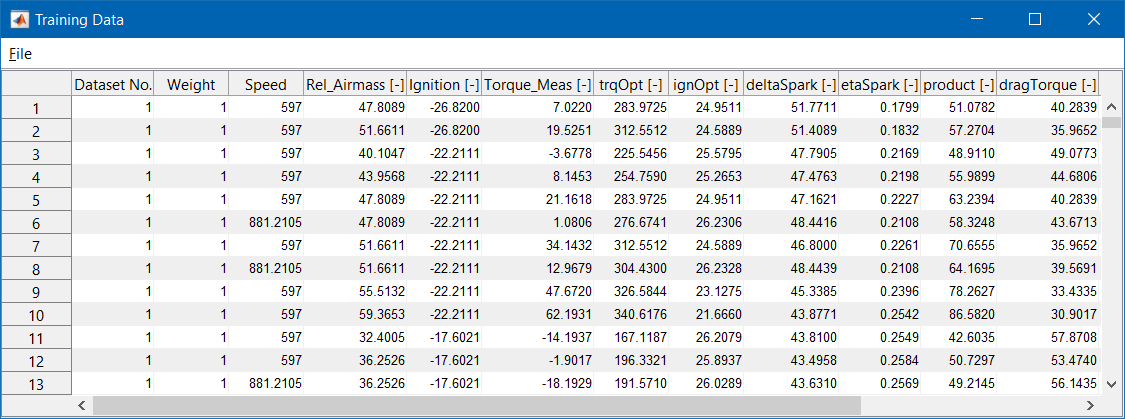 メニューコマンド Analysis > Data Table > Training Data / Test Data / Training and Test Data を選択すると、インポートされたデータの列、変換されたデータの列、さらにファンクションで算出されたノードを表示するテーブルが開きます。最適化目標が定義されている場合は、残差も表示されます。