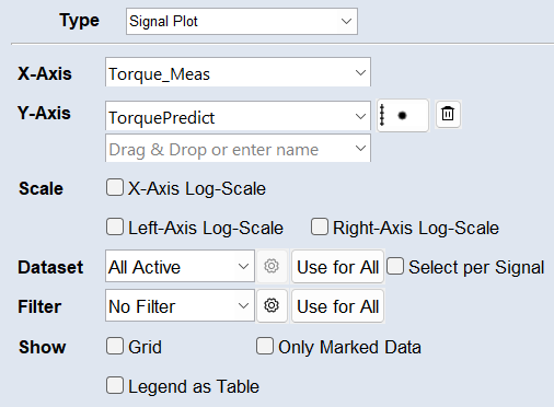 マーカーとプロット線の外観、および信号を右軸に表示するかどうかを設定できます。プロット上の信号を非表示にするには、Visible チェックボックスをオフにします。ダイナミックプロットプロパティボタンはグレイアウトします。