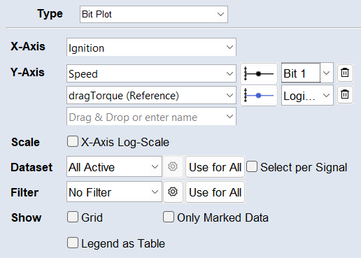 Y軸として設定する信号を、ドロップダウンから選択、テキスト入力、またはリストからドラッグ&ドロップすることができます