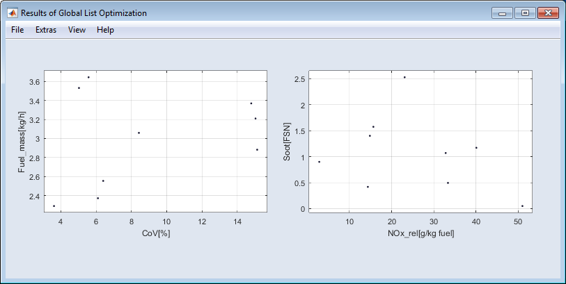 この機能は、単一目的最適化ウィンドウ(Optimization Single Result)とグローバル最適化ウィンドウ(Optimization Global Optimization)の Extras List Optimization から利用できます。