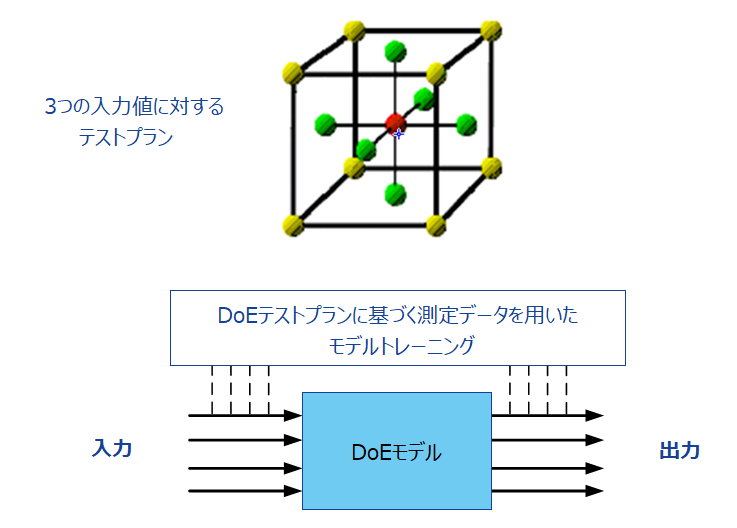 「実験計画法」(DoE: Design of Experiments)は、測定データに基づき未知のシステムをモデル形式で記述するためのものです。DoEの手順には、統計的側面に基づく実験計画の立案とモデルの作成、さらにモデリングされたシステムの最適化が含まれます。