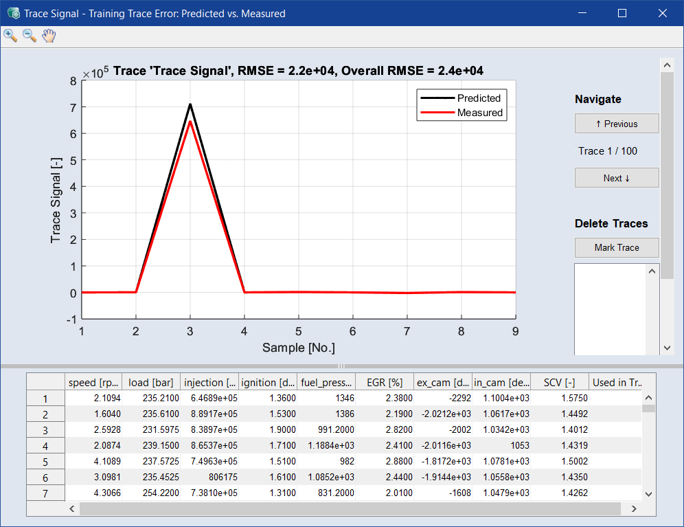 信号トレースモデルは、信号トレース(Predicted)の予測を可能にするものです。Measured カーブは、測定されたカーブのデータです。各信号の平均モデル誤差(RMSE)を表示して、モデルを評価することができます。インポートされたデータをすべてトレーニングデータとして使用している場合は、テストデータの誤差ウィンドウは表示されません。