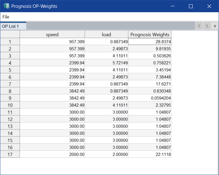 Prognosis OP-Weights ウィンドウでは、走行サイクルで定義された動作ポイントの重みを、必要に応じて手動で変更することができます。