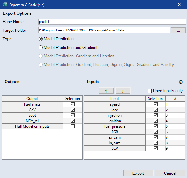 使用されている入力のみをエクスポートするには、Used Inputs Only を選択します。
