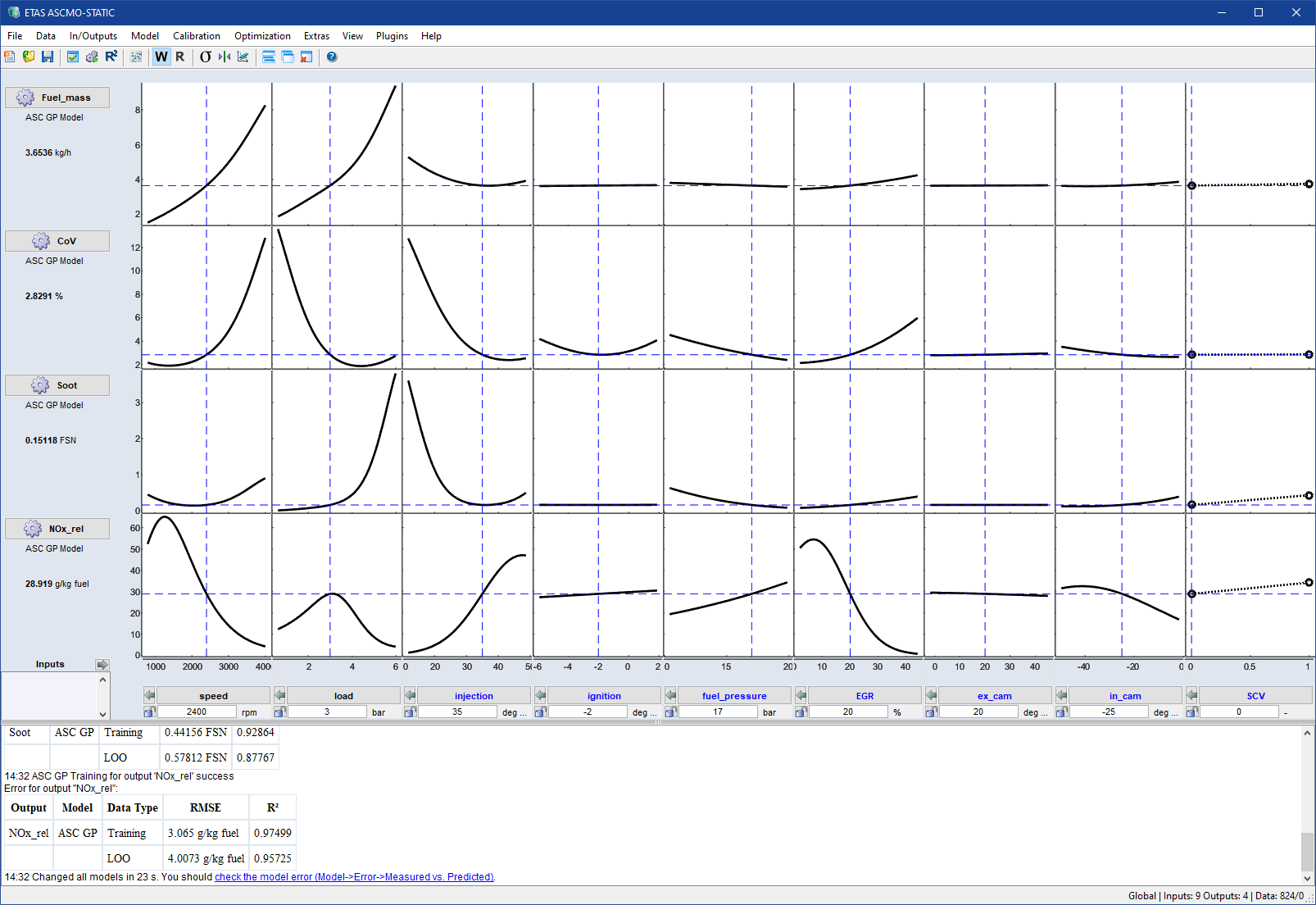ログウィンドウに、各出力のRMSEとR2が表示されます。これはモデル品質を示すものです。
