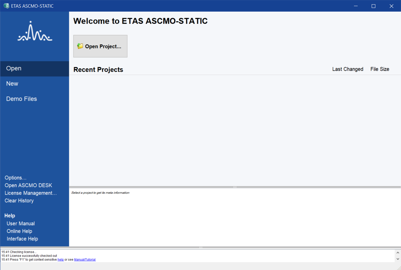 WindowsスタートメニューのETAS ASCMO V5.16プログラムグループから、ASCMO Desk V5.16 を選択します。