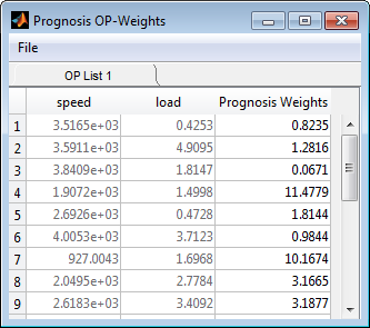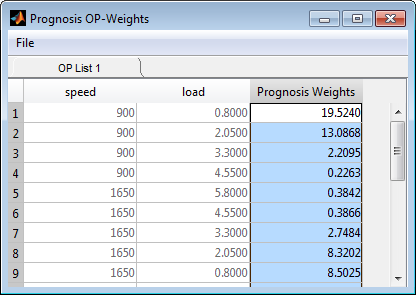 "Prognosis OP-Weights " ウィンドウでは、走行サイクルで定義された動作ポイントの重みを、必要に応じて手動で変更することができます。