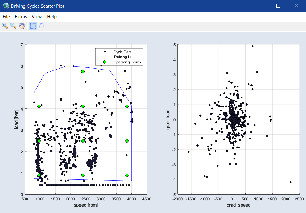 すべての囲み線のオーバーラップ部分に含まれるデータポイントを、すべてExcelファイル(*.xls、*.xlsx)、CSVファイル(*.csv)、MDF3ファイル(*.dat)、MDF4ファイル(*.mf4)のいずれかにエクスポートします。これらのデータポイントは、散布図内で