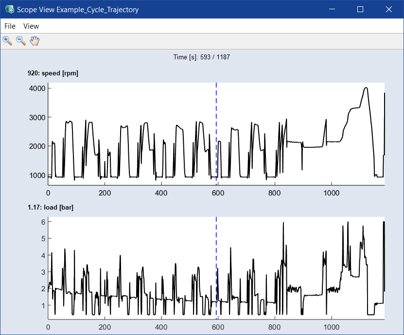 Scope View <driving cycle> ウィンドウには、選択された走行サイクルのデータが、時間軸に沿って表示されます。1つのスコープビューに複数の変数を割り当てると、各変数はそれぞれ異なる色でプロットされます。