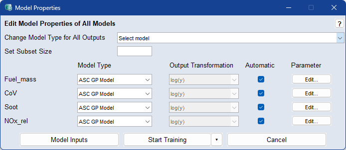 Model Inputs ウィンドウを開き、各出力変数のモデリングに使用する入力を選択します。