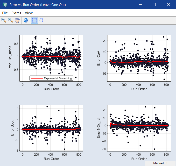 Error vs. Run Order ウィンドウには、算出された出力の、測定値に対する誤差が、測定番号順に表示されます。