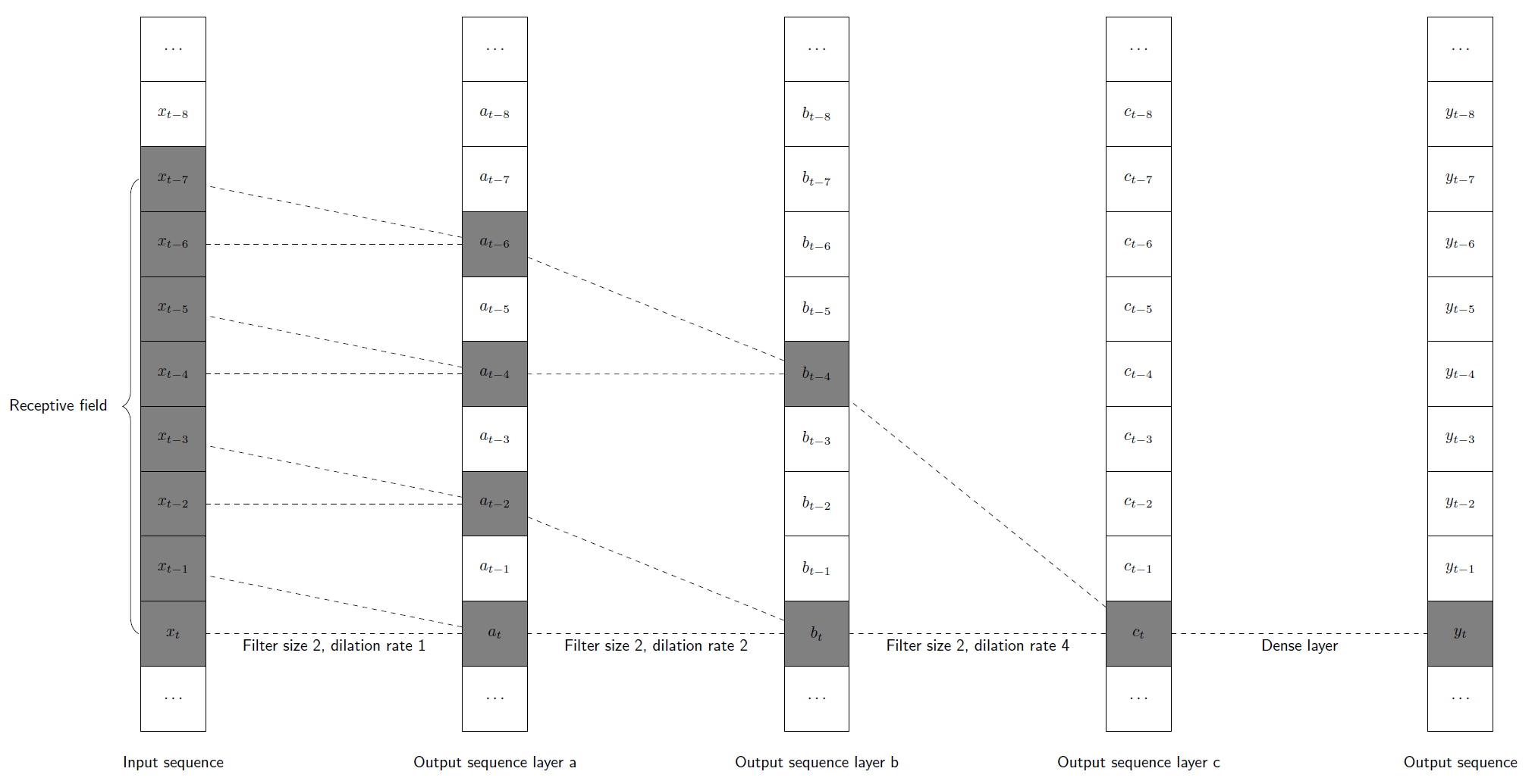 i番目の出力値yiの計算では、第1層のフィルタが(xi, xi-1, xi-2)に適用され、aiが得られます。次に、第2層のサイズ4のフィルタが配列(ai, ai-1, ai-2, ai-3)に適用され(すべての値は過去の時間ステップで計算されていることに注意してください)、biが生成されます。このbiが、最後の「密層(dense layer)」によって出力値yiに変換されます。