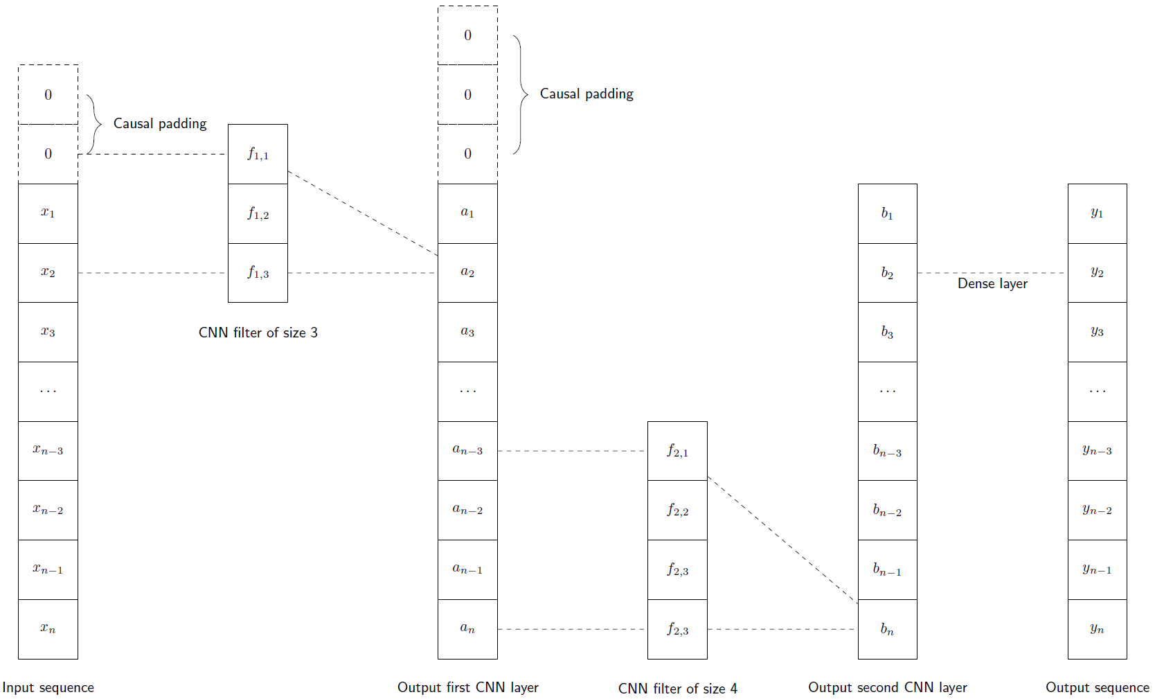 以下の図は、2つの畳み込み層とそれに続く密な層からなる1D畳み込みネットワークのスキームを示しています。単純化の目的で、インデックスが時間ステップを表す入力配列 x = (x1,....., xn) は1つのフィーチャーしか持たず、2つの畳み込み層はそれぞれ1つのフィルタしか持ちません。出力値を計算する際に未来の時間ステップが考慮されないようにするため、第1層の入力配列と出力配列には因果パディング(先頭にゼロを詰めること)が行われます。