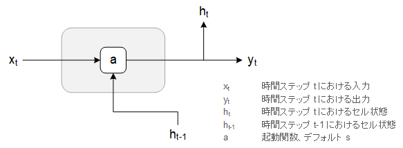 以下の図は最も単純な再帰型ネットワークセルである基本的なRNNセルです。このセルは、層の起動 a で表される単純な内部層を1つ持っています。ポイント t の時点における入力 xt に加え、前回の時点におけるセルの内部状態 ht−1 が xt に付加されます。つまり、過去の情報が後まで保持されます。これにより、後のイベントに対する応答に影響を与えることができます。つまりこの方法で、信号に対して遅れを伴う反応を非常に適切にモデリングすることが可能になります。