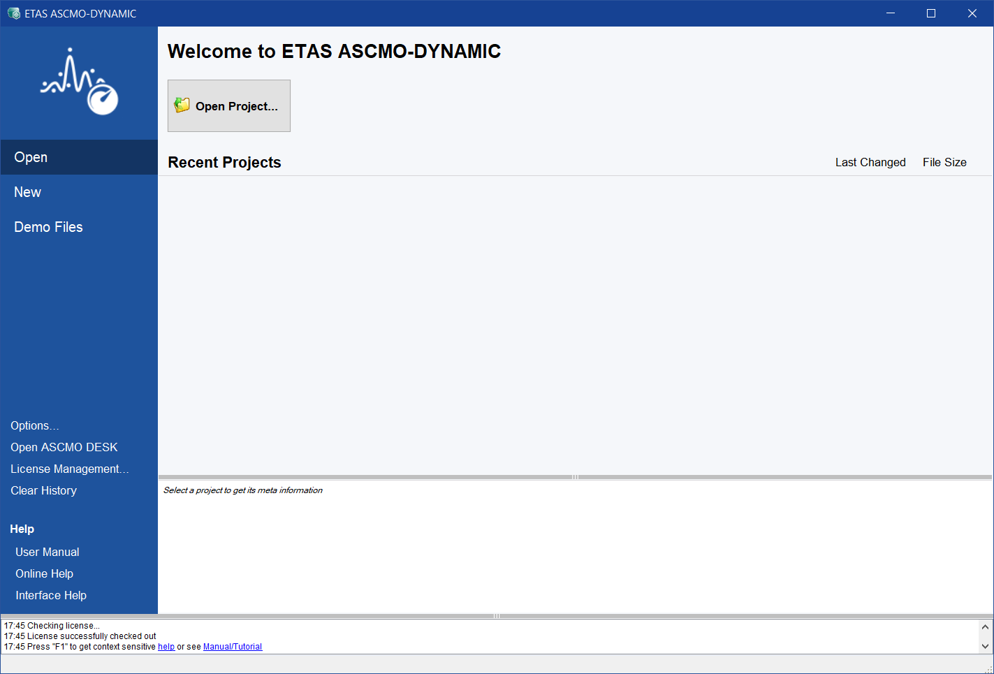 WindowsスタートメニューのETAS ASCMO V5.16プログラムグループから、ASCMO Desk V5.16 を選択します。