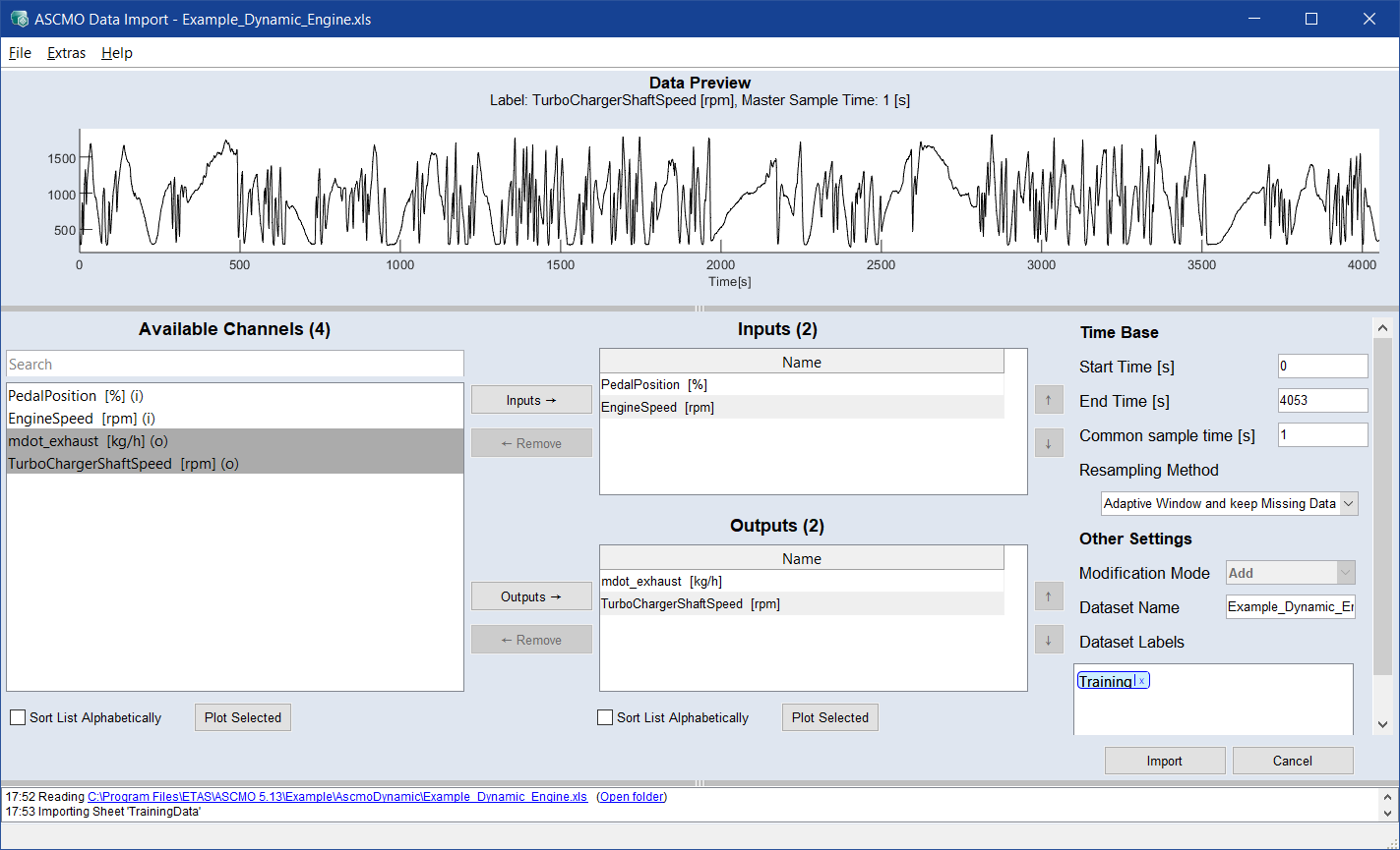 入力として PedalPosition と EngineSpeed を選択し、出力として mdot_exhaust と TurboChargerShaftSpeed を選択します。