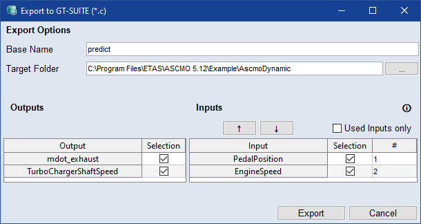 使用されている入力のみをエクスポートするには、Used Inputs Only を選択します。