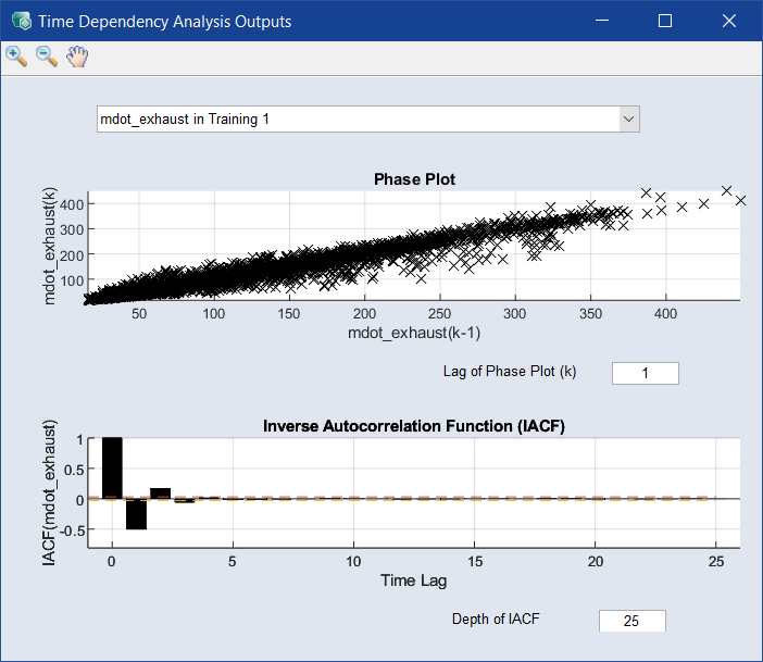 ACF(自動相関関数)とIACF(逆自動相関関数)による分析では、外生入力変数を伴わない線形時系列が想定されます。これはディーゼルエンジンの例のような非線形システムの同定には当てはまりませんが、これに基づいて、存在する時間依存性について最初の仮説を立てることはできます。