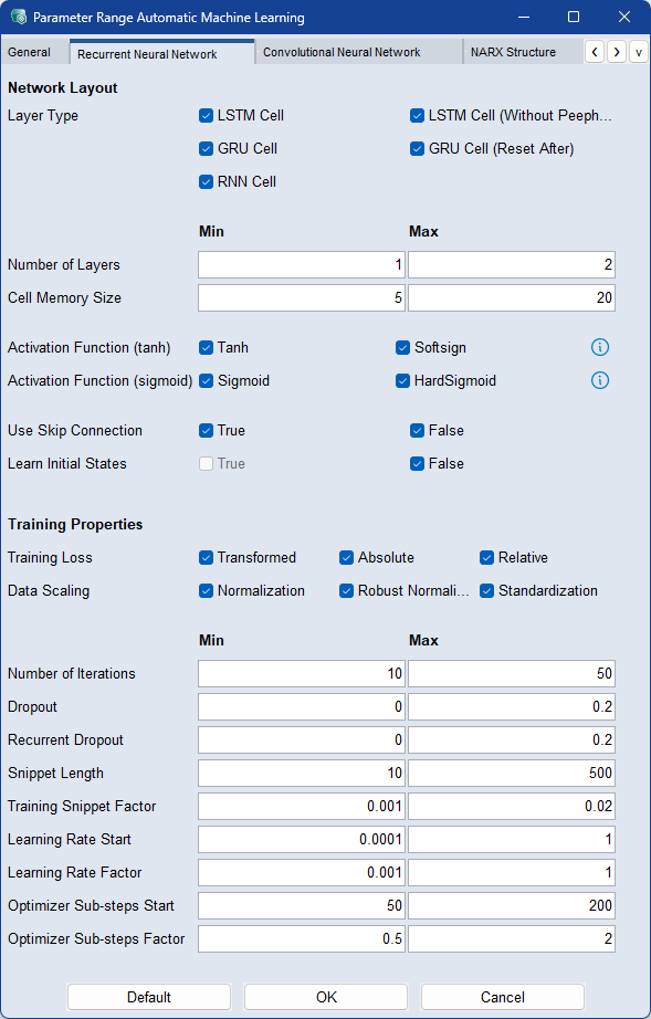 各パラメータについての詳細は、Model Configurations:Recurrent Neural Network (RNN)を参照してください。 |