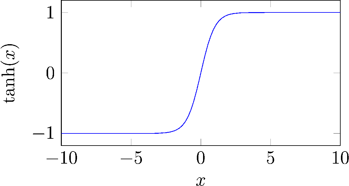 図20: ニューラルネットワーク層は一般的に、高次の数値配列と、その配列の内容を変更して次の層に渡す(=出力する)関数とで構成されます。これらの関数は一般的に起動関数と呼ばれます。図中に、その a) 双曲線正接(tanh)と、b) シグモイド関数(σ)が示されています。シグモイド関数は、tanhを用いて σ(x) = (1 + tanh(x/2))/2 で表されます。