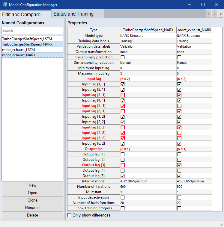 "Model Configuration Manager" ウィンドウ(Model > Configuration Manager)には、"Edit and Compare" タブ"Status and Training" タブが含まれます。
