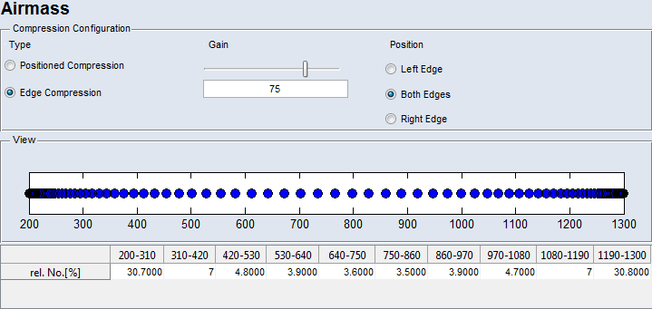 この領域には、測定ポイントの位置がグラフィカルに表示され、設定された圧縮のようすがわかります。テーブルには、圧縮により得られた各区間の測定ポイント数の割合("rel. No.[%]" 行)が表示されます。
