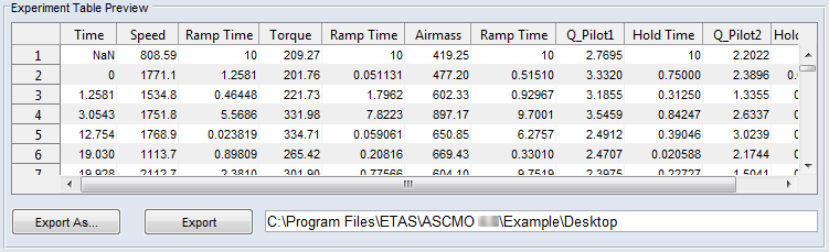 エンジンダイナモメータの目標値が定義されています。テスト装置において各行のすべてのパラメータが処理される絶対時間(Time)と、与えられた値に到達するまでの所要時間(Ramp Time)がエクスポートテーブルに表示されます。"Ramp Time" は値の勾配に依存します。"Hold Time" の列には、定義された値に到達するまで最も長い時間を要した入力に対するすべての入力の待ち時間が表示されます。