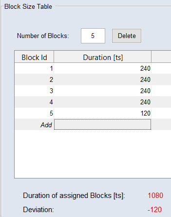 各ブロックの "Duration [ts]" を調整して、割り当てられた測定値の総数("Duration of Assigned Blocks [ts]")が測定値の数("Total Measurement time [ts]")と一致するようにしてください。