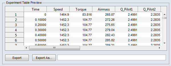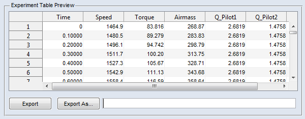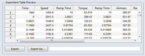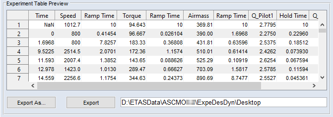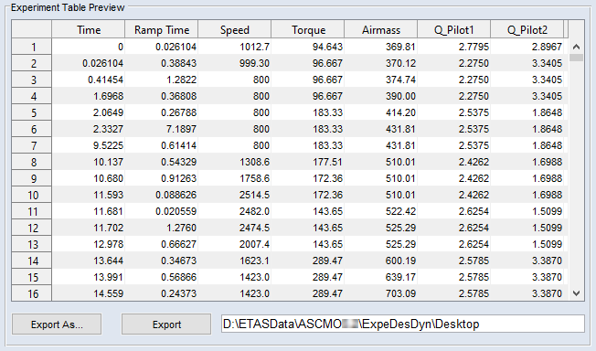 エンジンダイナモメータの目標値が定義されています。試験装置において当該行のすべてのパラメータの処理が終了した時点の絶対時間(Time 列)がエクスポートテーブルに表示されます。