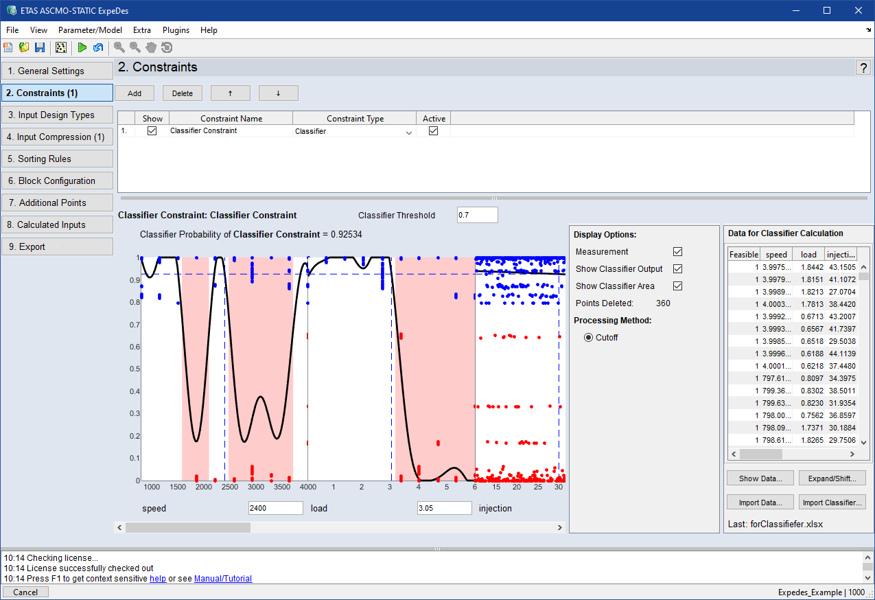 入力間の複雑な依存関係に依存する望ましくない測定領域に対しては、制限タイプとして分類器(Classifier)を使用することができます。既存のデータ(*.xls、*.xlsx、*.xlsm、*.csv、*.odcm)をロードして、分類器は過去の測定結果から望ましくない測定領域を学習することができます。