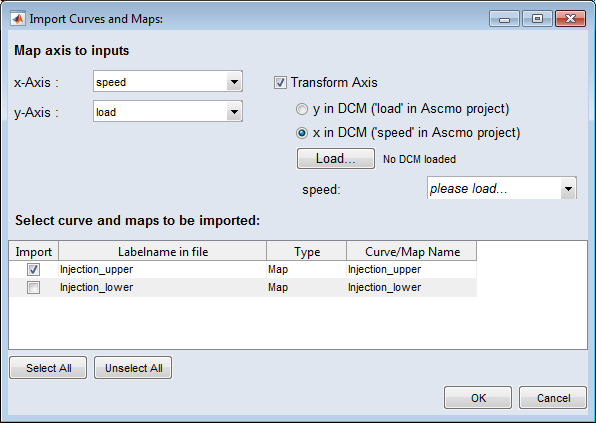 インポートしたいマップの軸が、使用されている動作ポイント軸(Speed / Load)の範囲全体をカバーしていない場合、マップの軸を変換(Transform)することができます。