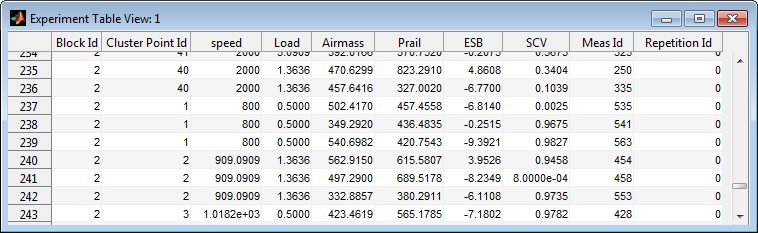 "Experiment Table View" ウィンドウが開きます。このウィンドウには、実験計画の各ポイントがテーブル表示されます。