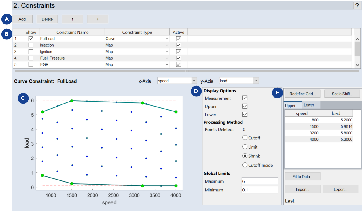 ウィンドウ下部に表示される情報(図14のC、D、E)は、Constraint Type の設定に依存します。