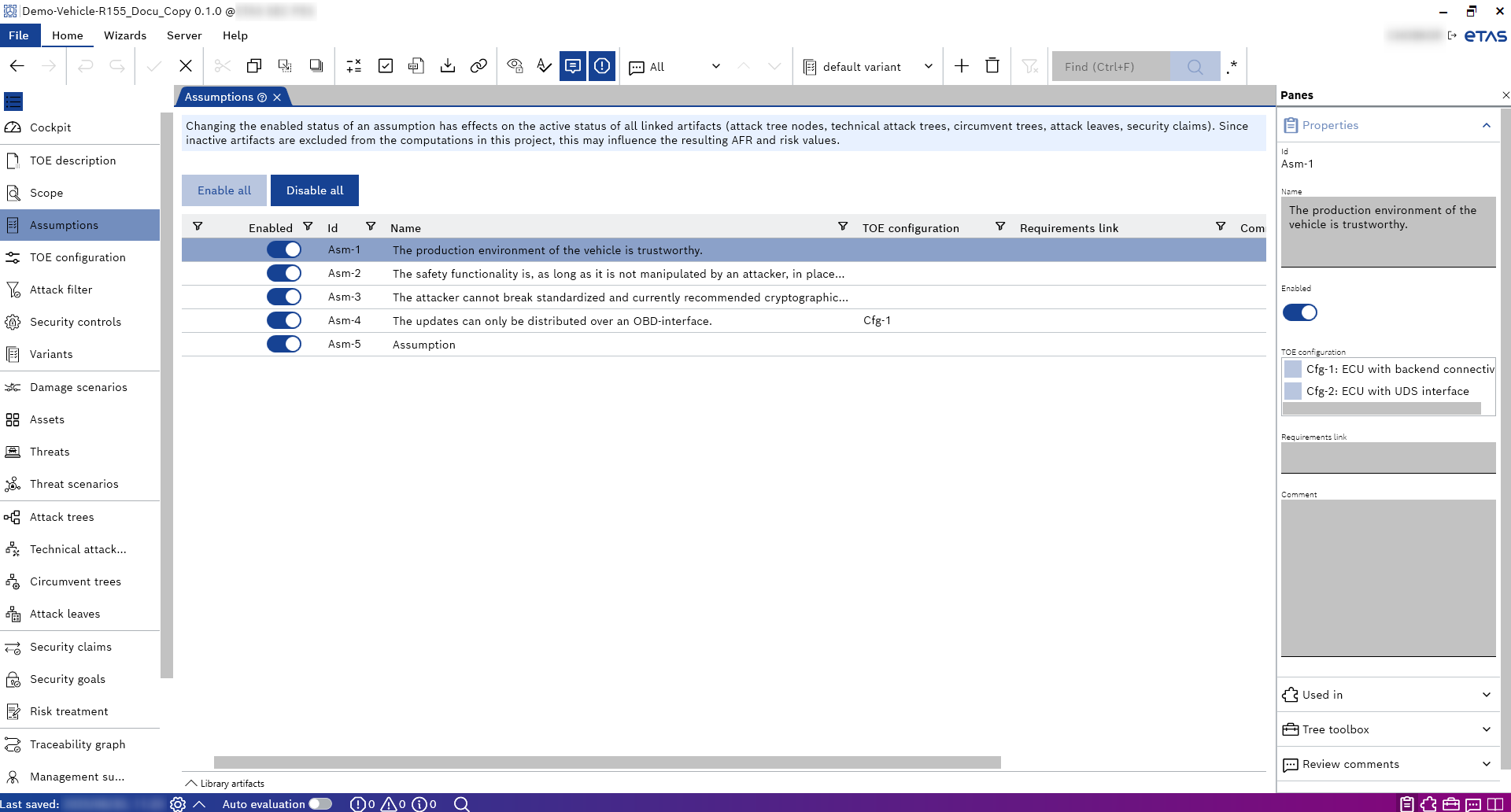 The assumptions can only be linked to the attack trees nodes and they can not be linked to other artifacts. Changing the enabled status of an assumption has effects on the status of all linked artifacts (E.g., Attack tree nodes, Technical attack trees, Circumvent trees, Attack leaves, and Security claims). The disabled artifacts are excluded from the computations, which may influence the resulting AFR and risk values.