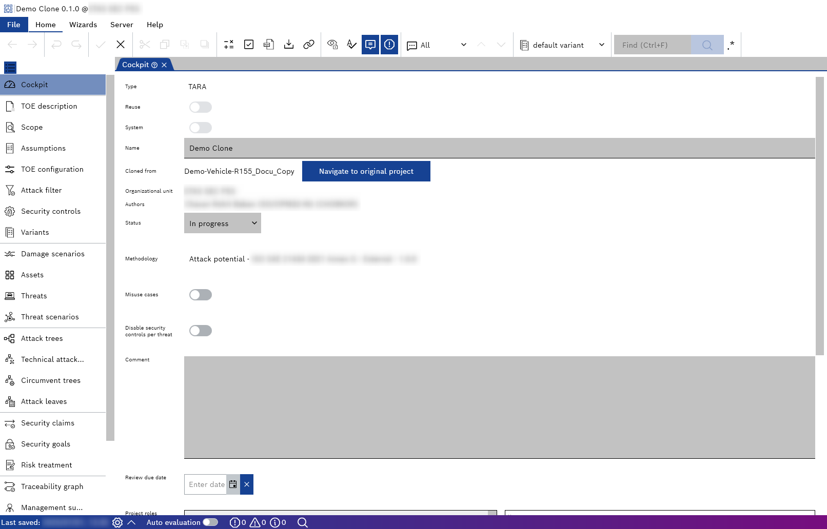 The new clone project is created and the "Cockpit" window is displayed with the metadata for the new clone project.