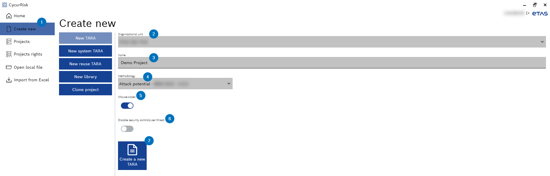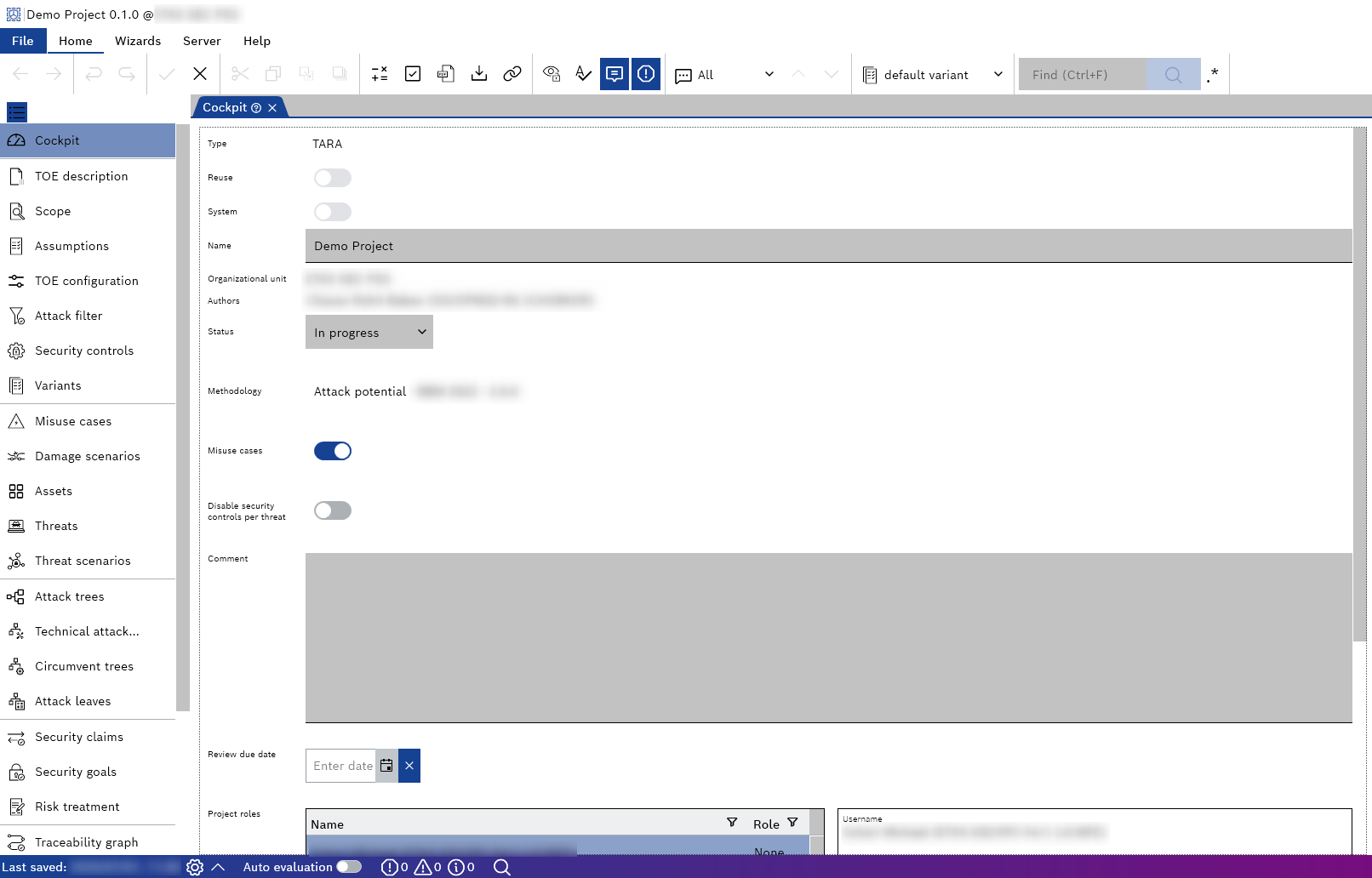 The project explorer window on the left corresponds to the TARA workflow. You can navigate it from top to bottom and it will lead you through the different steps required to complete the TARA project.