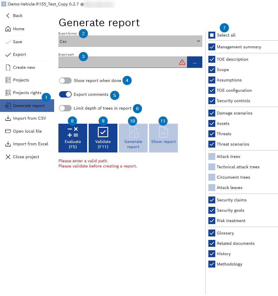 1. Click Validate. It is not mandatory to solve errors and warnings when generating a report. This step is optional.