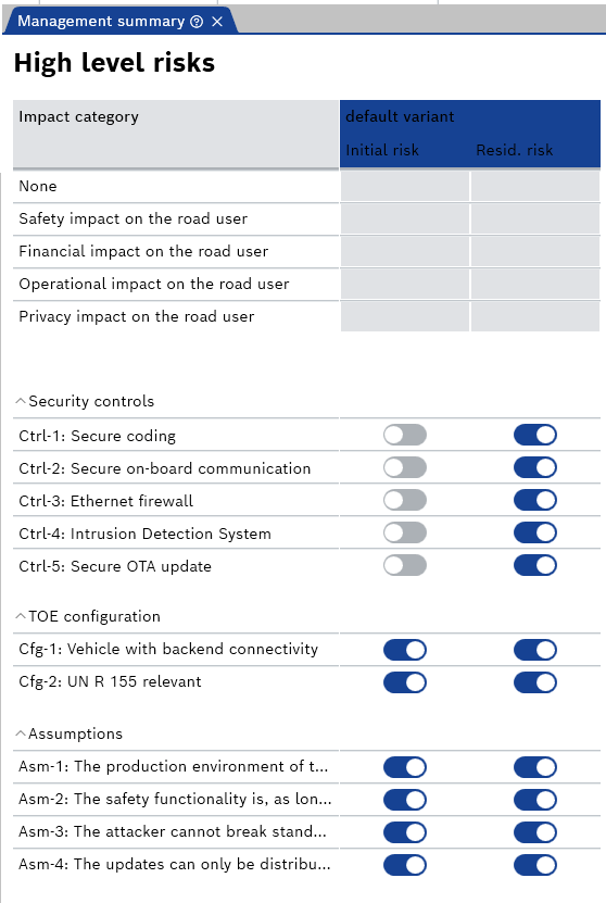 The first column shows the "Initial risk," i.e., the TARA risks. The initial risk can include enabled security controls, if these are already applicable for the TARA.