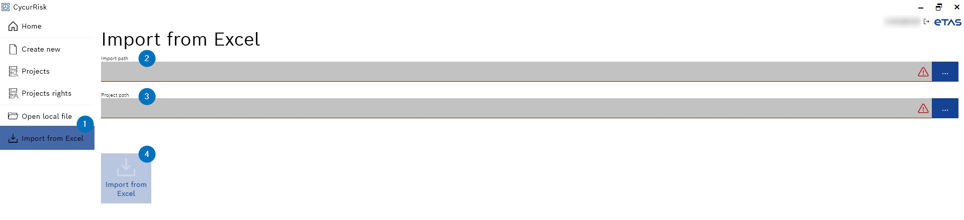 The import of a TARA project in Excel requires a proprietary template. If this import feature is required, you should contact ETAS via support. See Contact Information for more information. |