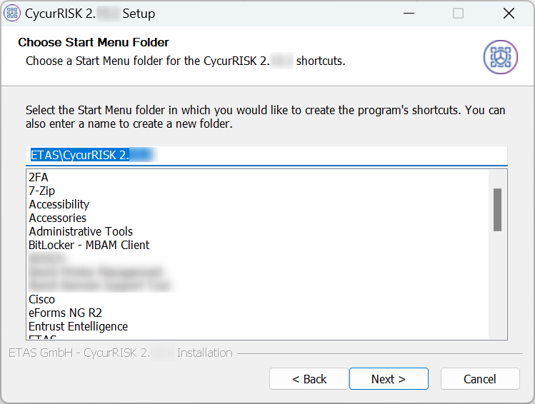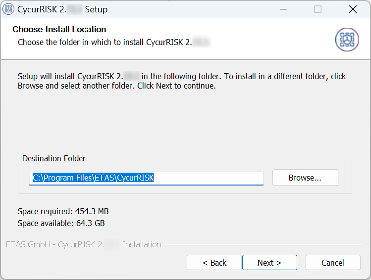 - By default, C:\Program Files\ETAS\CycurRISK folder will be created for installation. Specify the installation path or click Browse... to select the different folder to install CycurRISK.