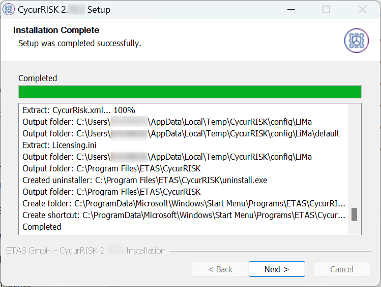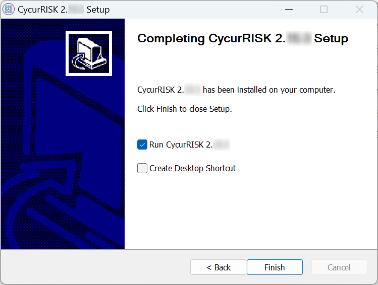 - CycurRISK is installed in the selected location. This will automatically delete the previous versions of the tool and old user configuration folders.