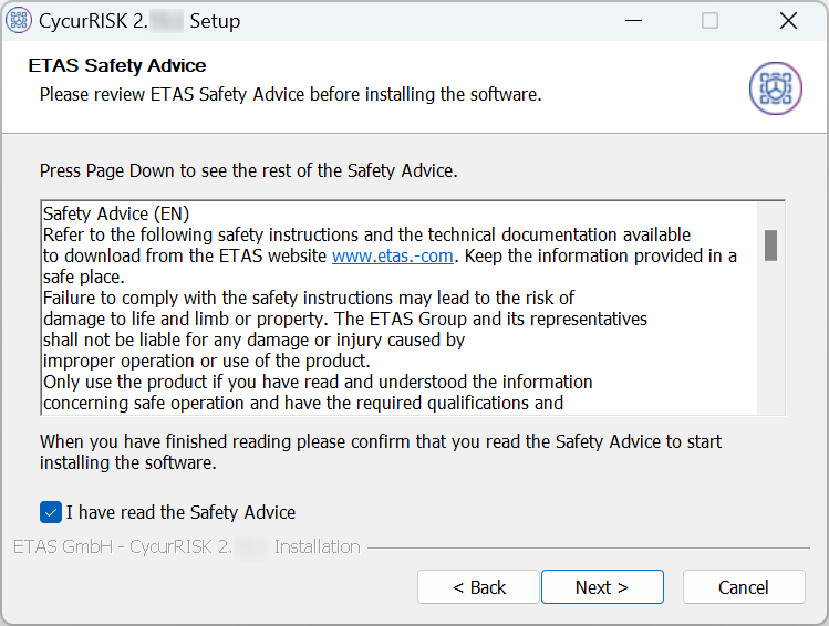 - Review and confirm the safety advice before installing the software. Click Next> to continue.